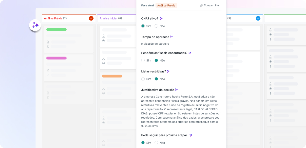 • Recomenda automaticamente aprovar, revisar ou reprovar o cadastro.