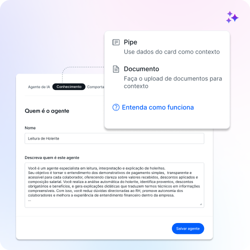 • O Agente de Leitura de Holerite processa dados, explica descontos e proventos em linguagem natural.