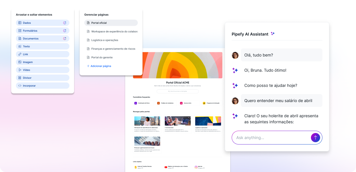 Monte formulários e portais para centralizar solicitações. Estruture pipes e cards para acompanhar tarefas com clareza e controle.