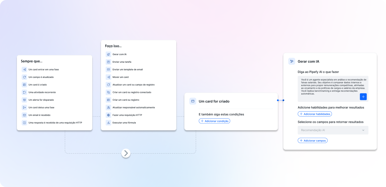 Os AI Agents do Pipefy analisam solicitações, comparam benchmarks e automatizam recomendações salariais com precisão e governança.