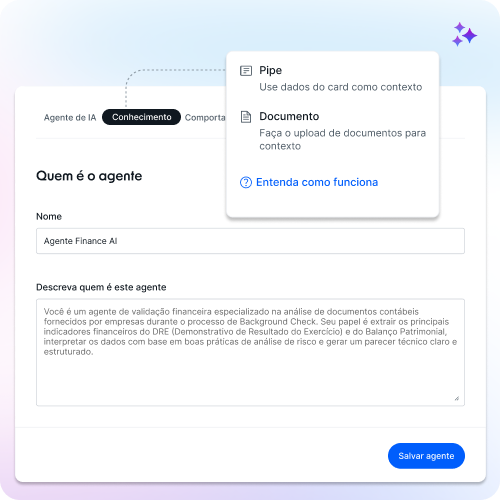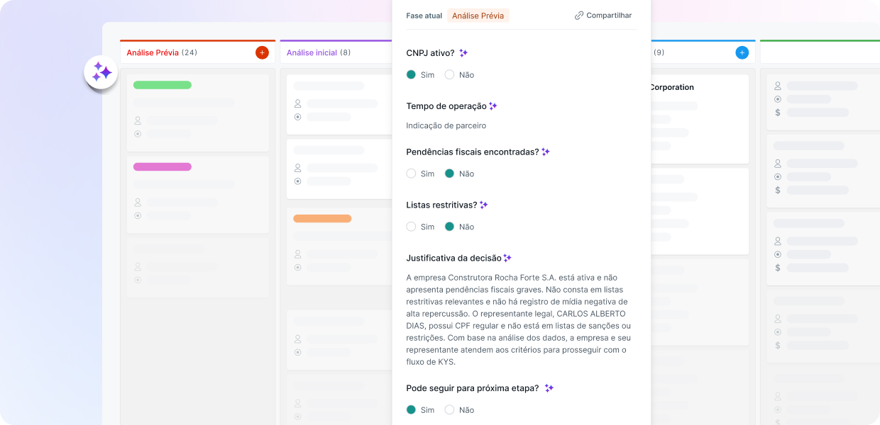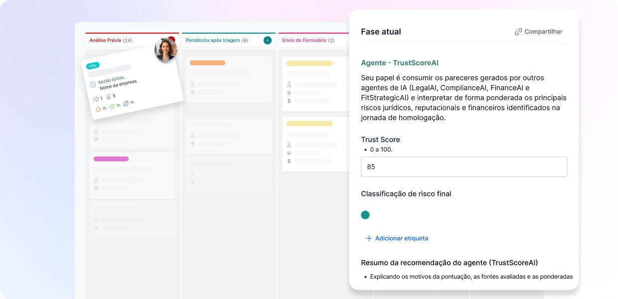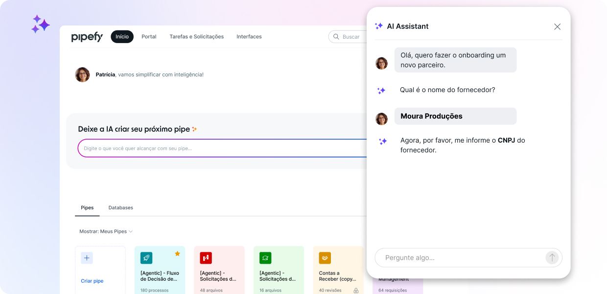 O Pipefy centraliza todo o processo de cadastro, validação e decisão, com AI Agents que executam análises jurídicas, financeiras e de compliance em segundos.