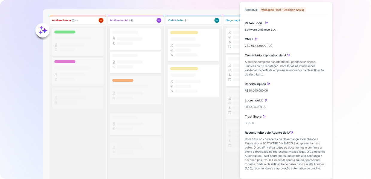 • Cada IA consulta bases externas, certidões e balanços automaticamente.